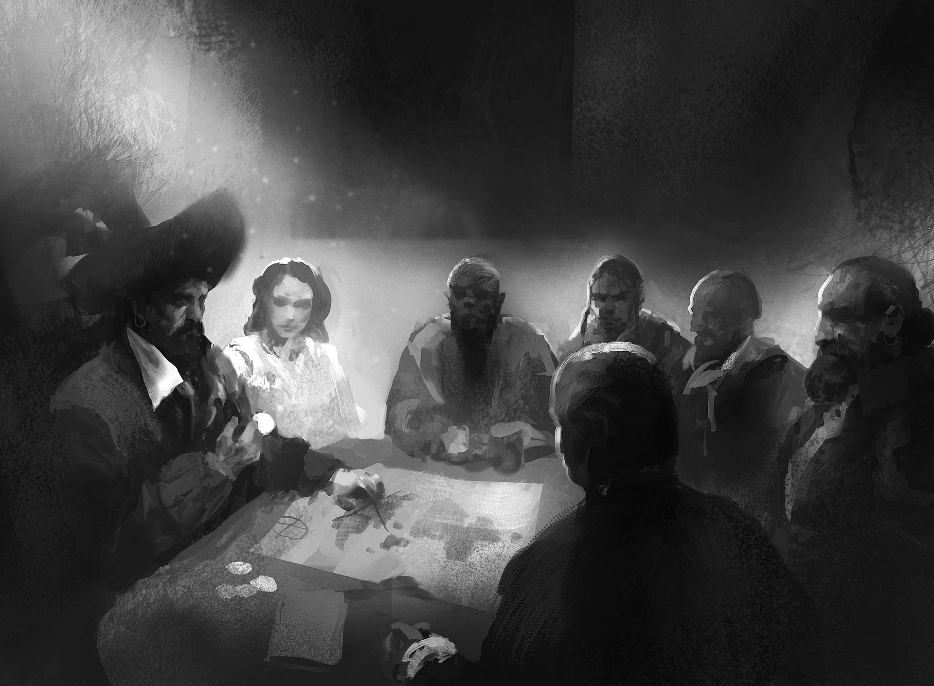 Con el paso del tiempo, otras naves se unieron al astuto capitán, y pronto aquella flota levantó un enclave en las cavernas al que llamaron Aguas Mansas. El nombre de aquel mítico capitán se perdió en el batir de las mareas. Sin embargo, en los años venideros su legado sería recordado bajo el título de Rey Tuerto, primer soberano de la bahía, cuyos sucesores portarían durante siglos la corona de conchas y perlas. Se cuenta que fue el sexto rey de la bahía quien fundó, junto a sus capitanes, la cofradía de los Hermanos Tuertos: una hermandad de marinos, piratas y truhanes que desde entonces aunaría a todos los habitantes de la bahía.